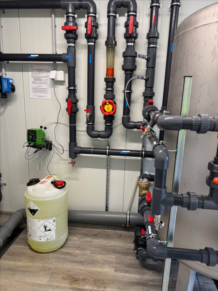 - Automatická chlorace – oxidace vody do filtrace + dávkování hydroxid sodný na vyšší pH 7,4