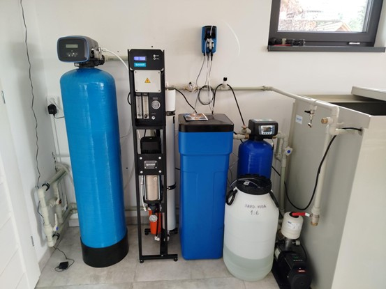 - Mechanický filtr + automatický MULTI filtr na tvrdost a železo + kompaktní reverzní osmóza s průtokem 250 litrů za hodinu + desinfekce vody pomocí dávkovacího čerpadla na chlornan sodný + zpětná mineralizace + akumulace s ATS stanicí na rozvod vody do objektu
